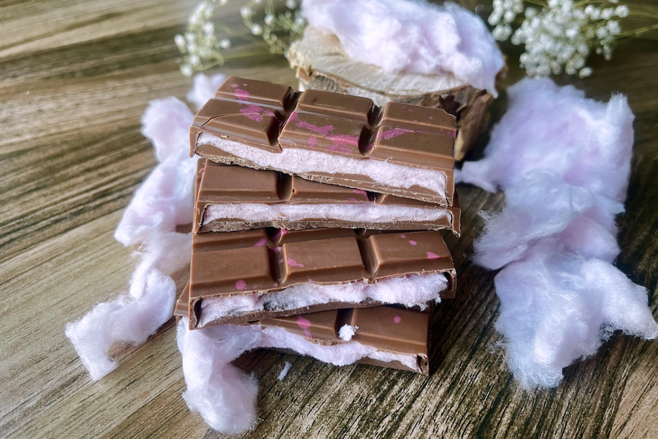 Ingredients: milk chocolate (sugar, cocoa butter, milk powder, cocoa 35%, sunflower lecithin, vanilla extract), strawberry cotton candy (sugar, flavoring, color (E120)), colors (E122, E129, E151, E170).