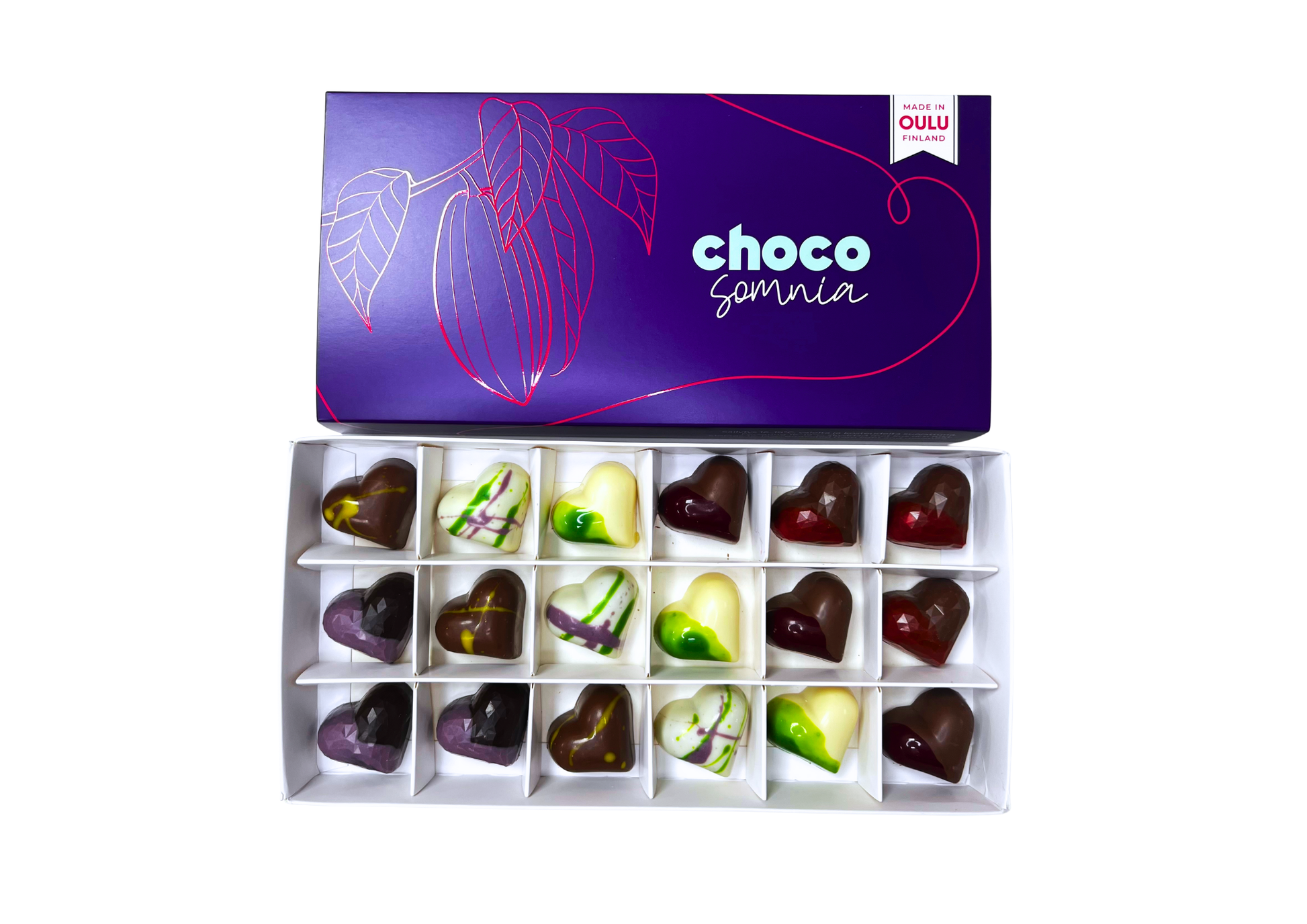 Pinkki 18 konvehdin rasia on täynnä herkullisilla käsintehdyjä konvehteja. Tämä konvehtirasia ei ainoastaan tarjoa herkullisia makuelämyksiä, vaan se myös viestii välittämistä sillä sen sisälle kätkeytyy vain sydämen muotoisia konvehteja. Kultaa hohtava, pinkki juhlarasia on herkullinen rakkauden osoitus.