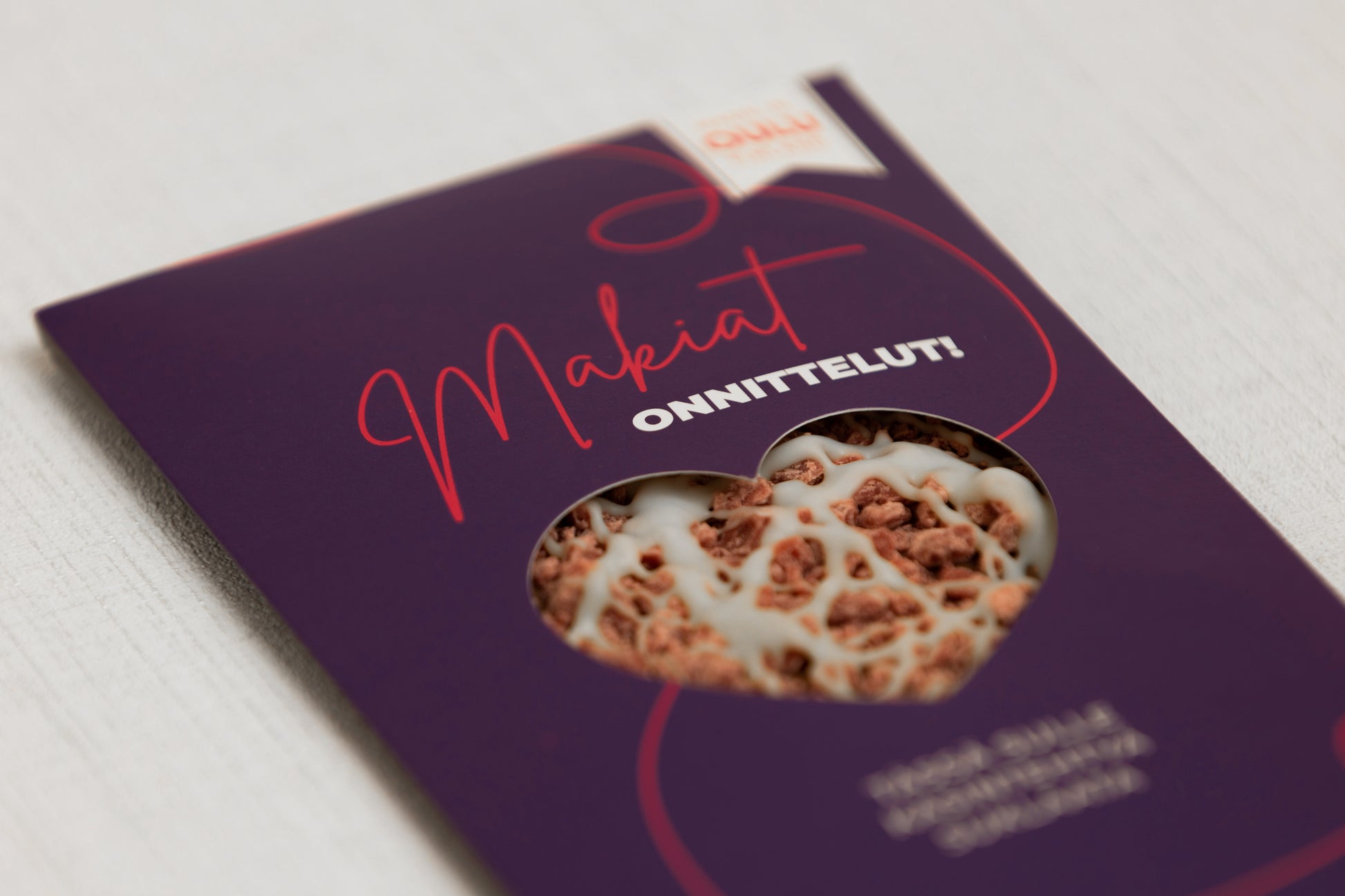 Suklaa kuin kortti. Maitosuklaalevyn makuna makea mansikka. Kuorista löytyy "Makiat onnittelut" ja tämä suklaalevy sopii tilanteeseen kuin tilanteeseen, kun vain onnittelun aihetta löytyy.