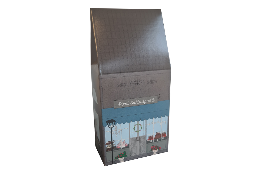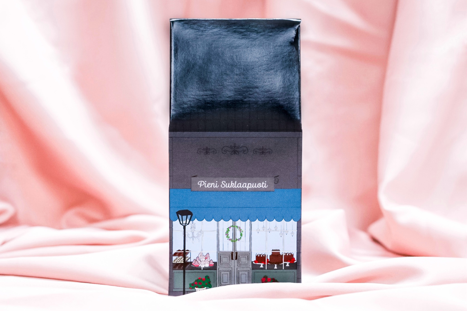 Teeleidin Pieni suklaapuoti -tee on musta teetä, joka on maustettu kaakaopavulla, krokanttilla ja kookoksella.