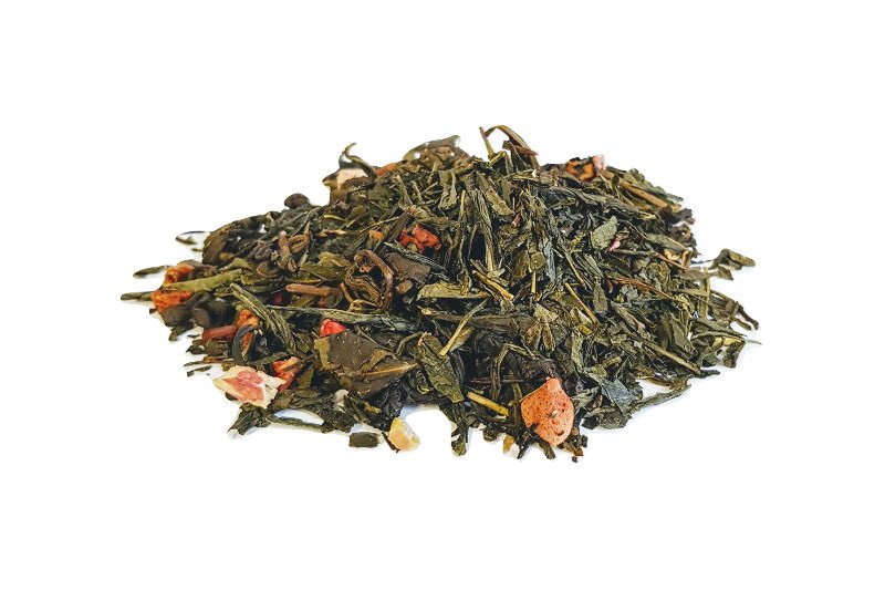 Ainesosat: Vihreä tee, omenan palat, pakastekuivattu mansikka, pakastekuivattu raparperi.