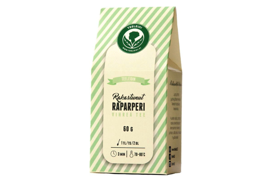 Teeleidin Rakastunut raparperi -tee on vihreää teetä, jossa maistuvat rapsakka raparperi, makeat mansikat sekä mehevät omenat.