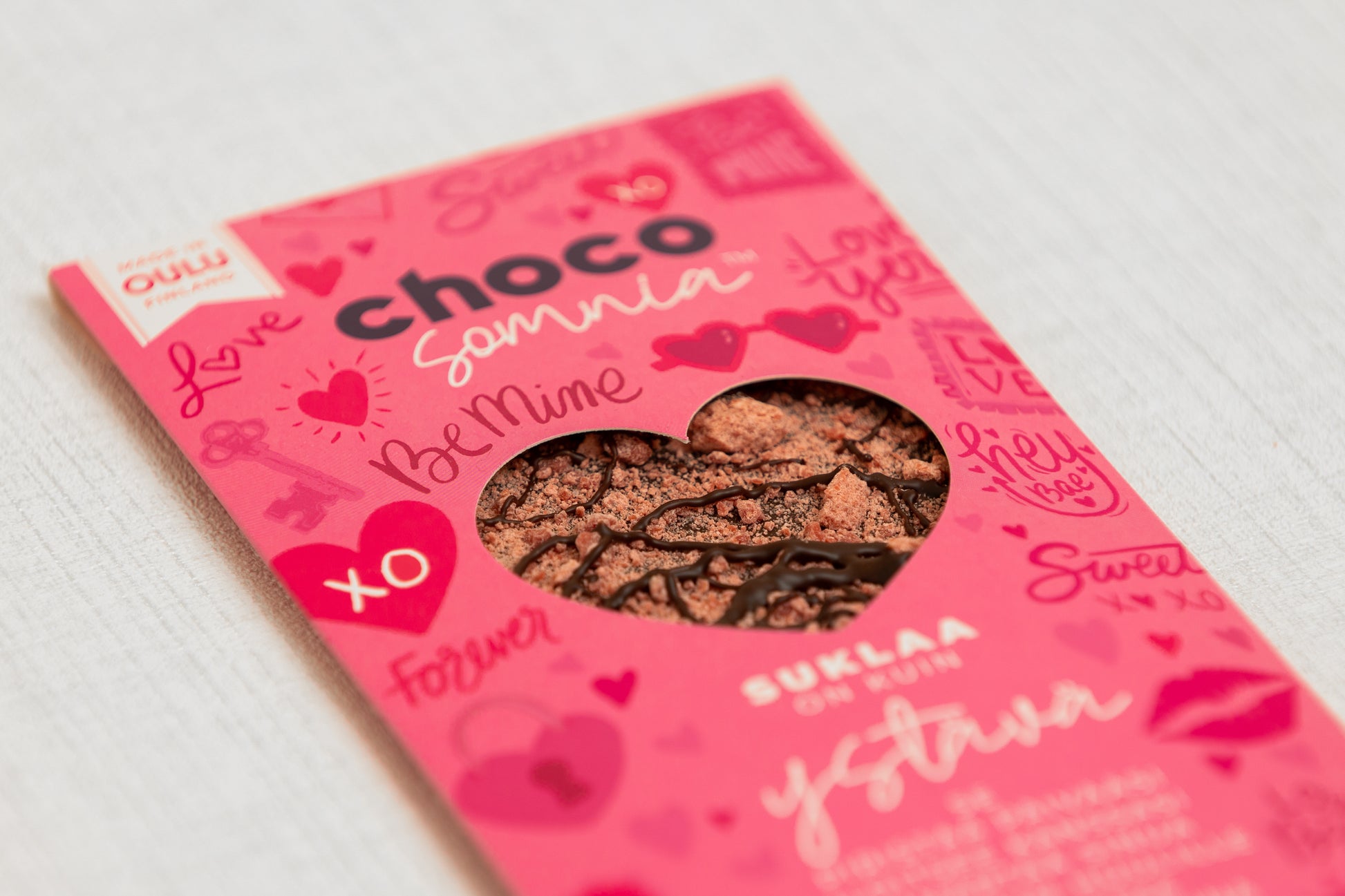 Ainesosat: Tummasuklaa (kaakao 62%, kaakaovoi, sokeri, emulgointiaine auringonkukkalesitiini, vaniljauute), mansikka.