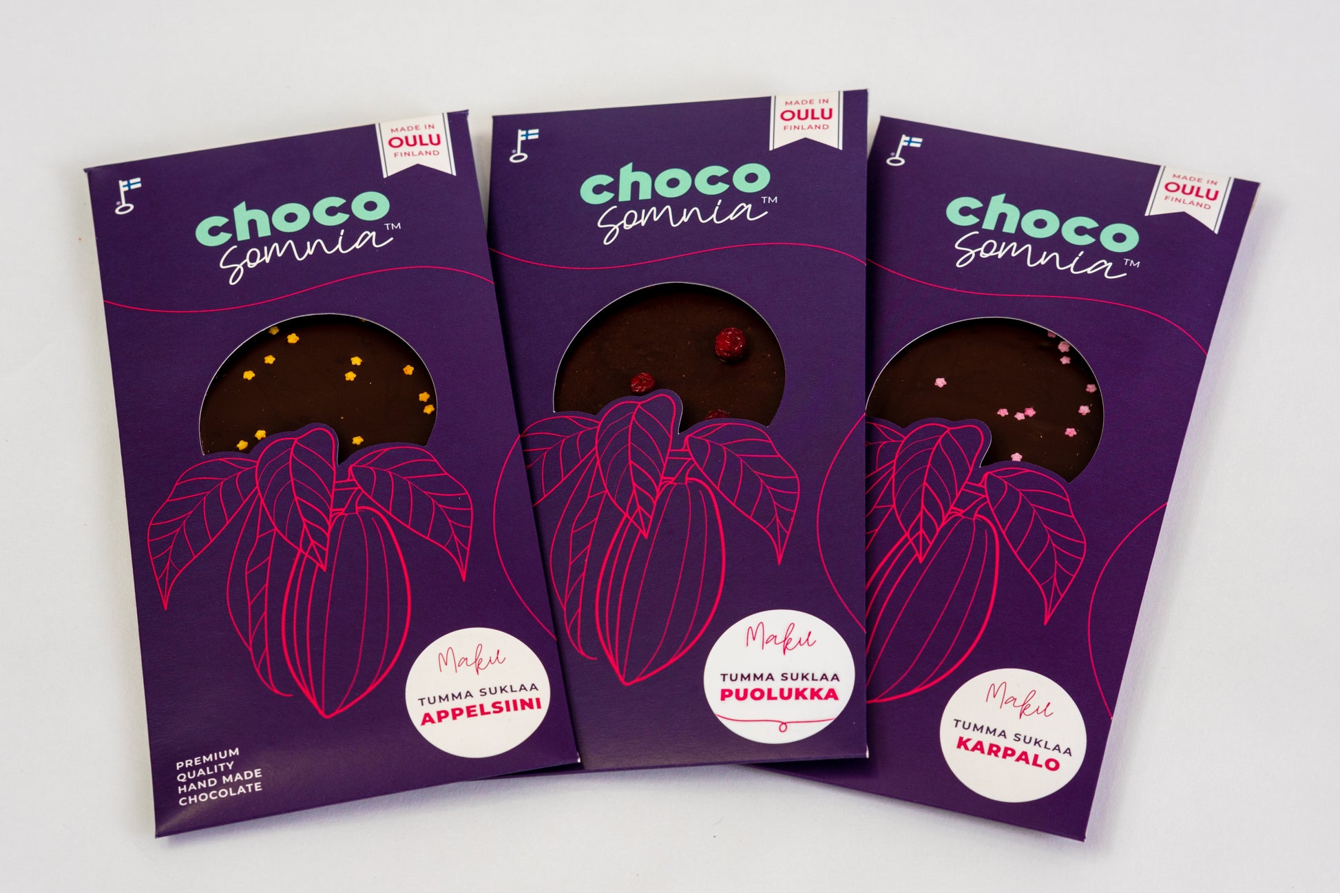 Ainesosat: Tummasuklaa appelsiini: tummasuklaa (kaakao 62%, sokeri, kaakaovoi, emulgointiaine auringonkukkalesitiini, vaniljauute), appelsiiniöljy, sokerikoriste. Tummasuklaa puolukka: tummasuklaa (kaakao 62%, sokeri, kaakaovoi, emulgointiaine auringonkukkalesitiini, vaniljauute), suomalainen puolukka. Tummasuklaa karpalo: tummasuklaa (kaakao 62%, sokeri, kaakaovoi, emulgointiaine auringonkukkalesitiini, vaniljauute), karpalo 7%, sokerikoriste.