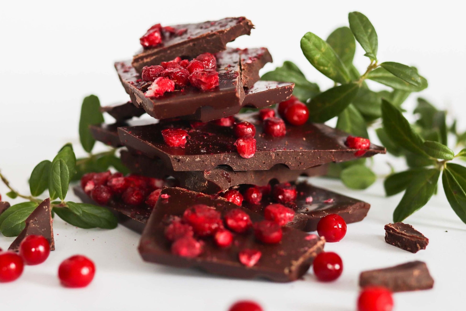 Ingredients: Dark chocolate with orange: dark chocolate (cocoa 62%, sugar, cocoa butter, emulsifier sunflower lecithin, vanilla extract), orange oil, sugar decoration. Dark chocolate with lingonberry: dark chocolate (cocoa 62%, sugar, cocoa butter, emulsifier sunflower lecithin, vanilla extract), Finnish lingonberry. Dark chocolate with cranberry: dark chocolate (cocoa 62%, sugar, cocoa butter, emulsifier sunflower lecithin, vanilla extract), cranberry 7%, sugar decoration.