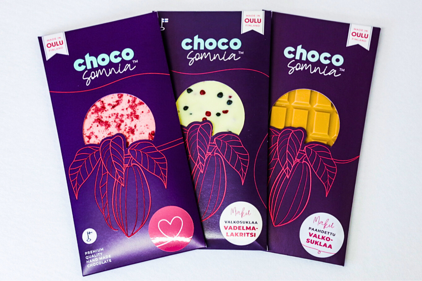 Ainesosat: Valkosuklaa vadelma (sokeri, kaakaovoi, täysmaitojauhe, emulgointiaine auringonkukkalesitiini, vaniljauute), vadelma (3%), aromi (E1518, E1520). Valkosuklaa vadelma-lakritsi: valkosuklaa (sokeri, kaakaovoi, täysmaitojauhe, emulgointiaine auringonkukkalesitiini, vaniljauute), vadelma-lakritsifudge (sokeri, tärkkelyssiirappi, auringonkukkaöljy, inverttisokerisiirappi, ammoniumkloridi, aromit, emulgointiaine auringonkukkalestiini, lakritsiuute, sitruunahappo, mehiläisvaha, seljanmarjatiiviste). Paahdettu valkosuklaa: suklaa (kaakaovoi, sokeri, täysmaitojauhe, rasvaton maitojauhe, herajauhe, voirasva, emulgointiaineet auringonkukka- ja rapsilesitiini.